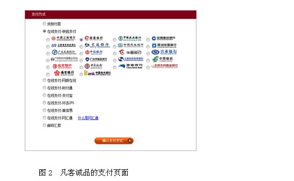 我们以国内知名的B2C销售网站凡客诚品为例,VANCL提供了快钱网上支付、网银在线网上支付、环迅IPS网上支付、网汇通网上支付、财付通账户支付、首信易支付和支付宝支付七种在线支付方式,几乎涵盖所有大中型银行发行的银行卡,覆盖率达98%,包括可通过在邮局购买网汇通卡进行网汇通线上支付和充值财付通账户进行支付。如图2所示为在凡客诚品的支付页面上所列出的支付方式列表。
