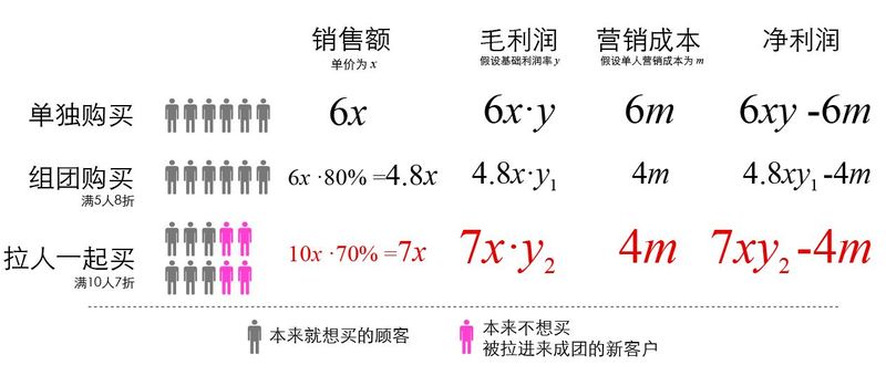 商家角度说,我们来算一笔账,就知道商家为什么从团购中获利,也为什么有无数商家因为团购在亏钱。下图,零售价为x元的商品,利润率为y,单人营销成本是m,商家的促销政策是5个人一团8折,10个人7折。那么