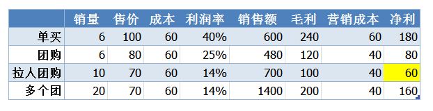 商家什么时候不能多赚钱?上面的公式变量非常多,很容易就不赚钱了。比如下面这个算式,本来单卖6个可以赚180元,团购才能赚60元,只有超过2个10人团的时候才能接近单卖获得的利润。