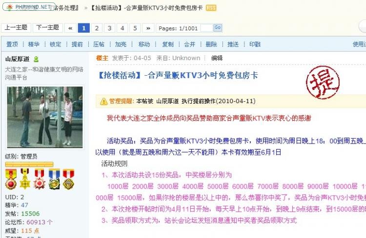 3、线上活动:不管是什么活动,有活动就好,网站不能没有线上活动,我组织过的线上活动主要为论坛踢楼活动,以群为单位的踢楼活动,虽然奖励的是虚拟论坛币,但是人气也很好,还有就是商家的抢楼活动,我和当地KTV做了一个抢楼活动,7个小时的时间抢楼15000楼,送出15张包房卡,大家都高兴。