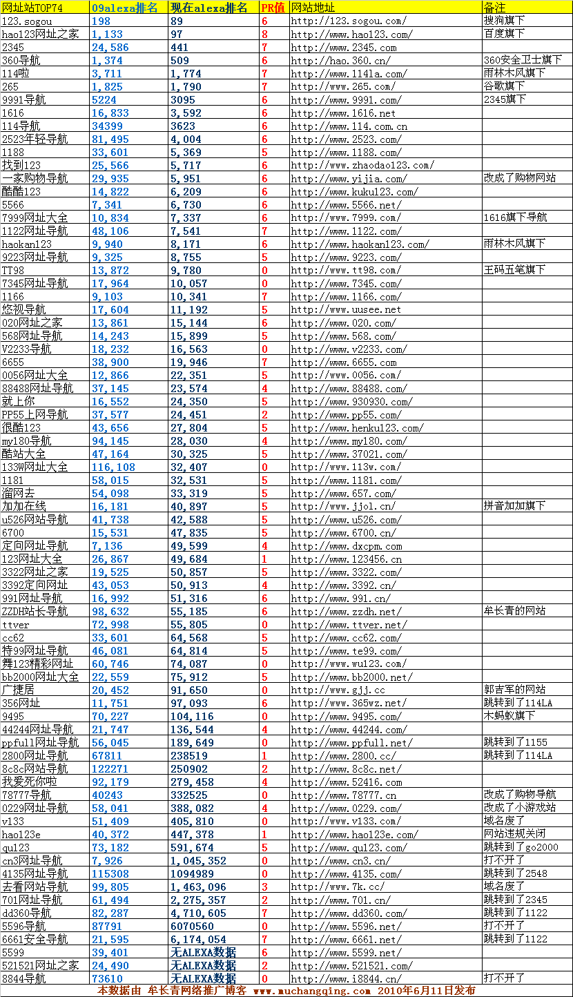 以前的导航站文章的分享主要是按导航站的ALEXA排名进行了归纳总结或分享了一些导航站的联系方式,或者简单介绍了下部分知名的网址导航站。这次的导航站总结比起之前的文章又有了不同的新意,会把09年总结的TOP74个导航站的数据2次更新下,看看在这1年的时间里,有多少导航站已经销声匿迹或者已经被同行收购,又有多少导航站越做越好了。这次也加上了PR值这个选项,让大家有更多的数据可以参考。