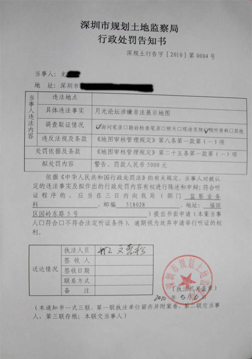 他向媒体表示,“具体什么等级泄密对方没说。据《深圳市规划土地监察局行政处罚告知书》上所列,具体违法事实是‘月光论坛涉嫌非法展示地图’,违反法规及条款是:《地图审核管理规定》第八条第一款第(一)项。”