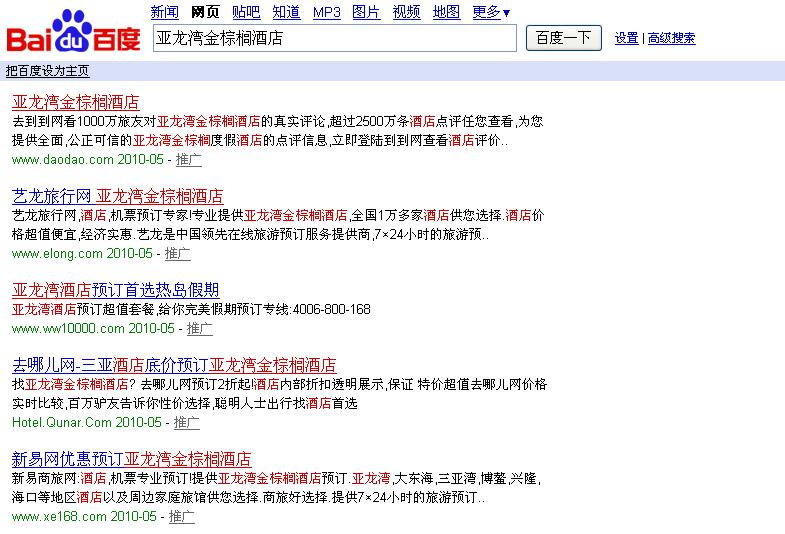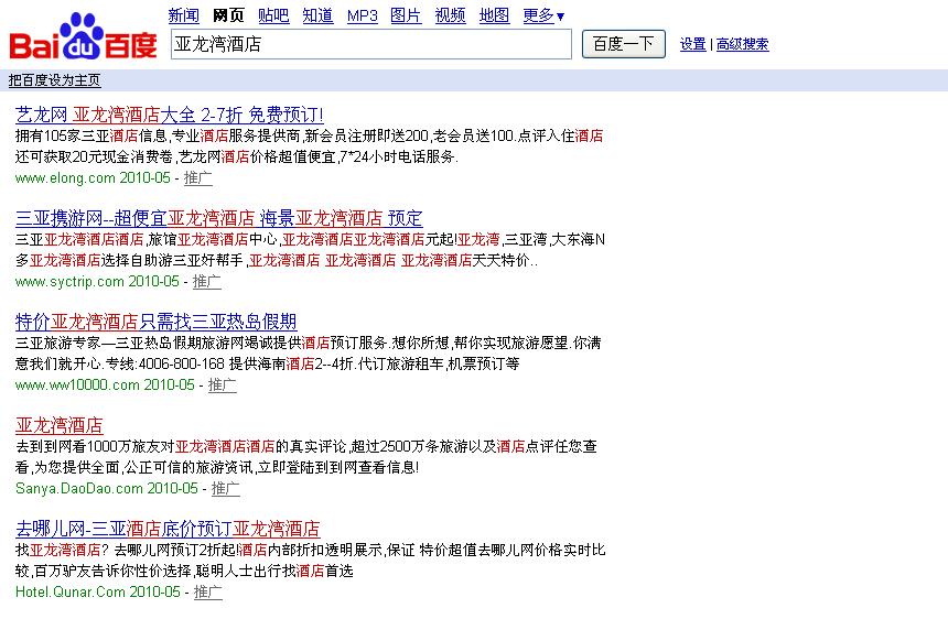 这是一个开放的案例,对于实情我和读者一样没有任何了解,只是提个头来开展一下讨论。单纯就这两则搜索结果来说,我们可以认为艺龙在三亚这一块的SEM投放上可能比较强。但问题是,艺龙是否应该得到第一或者第二位呢?艺龙是Efficient Frontier的用户,SEM投放是自动化管理的,自动化管理是status quo,是基于现状的管理,如果没有人为限制,不会像我的那个实战案例中那样专门去冲击第一位并承担损失。而从这两则搜索结果来说,其他的广告主有可能也基于现状在进行SEM管理,因为这些产品明显有差异性,但没有在排名中充分体现出来。(尤其在百度凤巢系统中,质量得分比较弱的情况下,价格与产品同质性的关系应该更加密切)。那么,到底是谁做了什么?或者谁没做什么呢?欢迎大家发表意见。