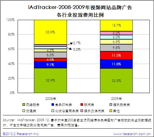 再看一张对比图,早期中国视频行业最大的广告主就是网络服务(网络游戏、电子商务),2009年这一格局还未改变,但可以看出占比有下降趋势。上升最快的是快消品(如食品饮料)、服装、日化等领域,涨幅都超过了100%,这些都是大品牌林立的领域。未来这种趋势将更会更趋明朗化。