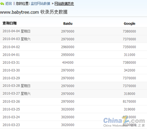 谷歌(Google)前亚太区营销总监王怀南和前易趣创始人邵亦波联合创办的网站宝宝树的谷歌收录变化: