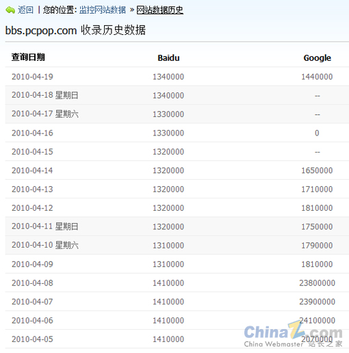 泡泡网在4月5日至4月19日的Google收录数变化(站长之家配图)