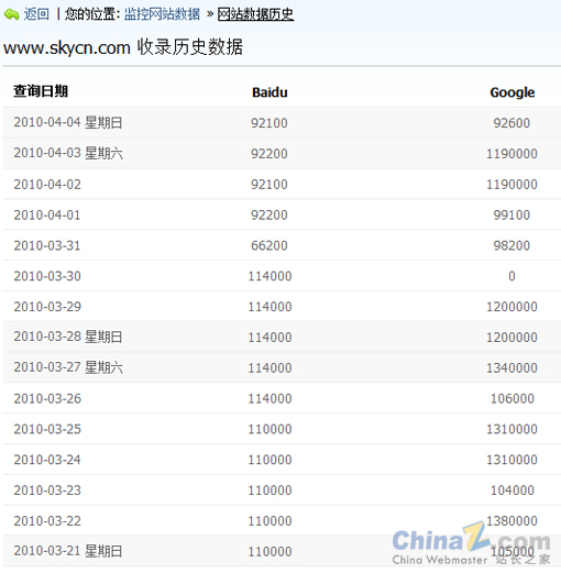 天空下载站在3月21日至4月4日的Google收录数变化(站长之家配图)