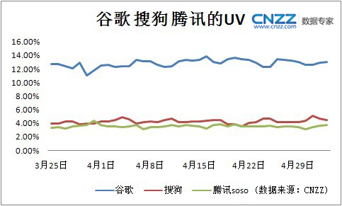 2010年4月份 谷歌 搜狗 搜搜为中小网站提供的来路流量对比(数据来源:CNZZ.COM)