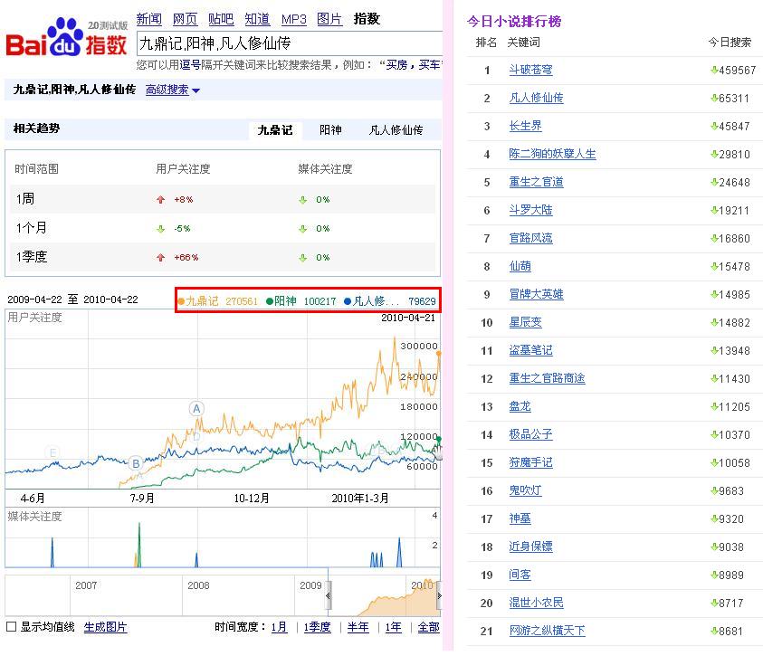 后来我仔细分析了下,现在百度小说风云榜上推荐的小说,基本上都是1年以前就有的老小说,而最近1年才新推出的小说却都不见踪影。比如“九鼎记”和“阳神”大家通过上图可以看到,都是去年7月份左右才开始有指数,因为这2部小说是那时候才开始在起点首发。而另外部小说“凡人修仙传”,已经推出很久了,早在1年前就已经有几W的百度指数,只是人气一直没什么进步。