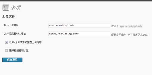然后进入Wordpress 管理后台设置:控制面板--设置--杂项--文件的完整URL地址填写http://farleeimg.info/,设置如下图: