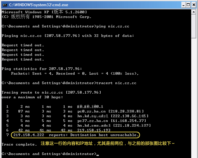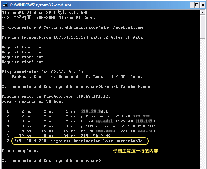 仔细注意 tracert 的结果,有兴趣的朋友可以查查被截断的IP是哪里的,这样那个岗哨的位置我想大家就明白在哪里了吧~另外,我现在在郑州出差,所以,tracert 的结果前半段显示的是河南,您自己 tracert 前半段就是自己的省市级节点。看到延迟忽然升高的地方,除了那个岗哨,就说明“出国”了~