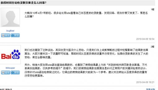 消息来自刚刚成立的百度官方站长俱乐部。对于这个俱乐部也不知道是真假,但是语气极其像百度官方。吧主kkksuper称百度收录方面没什么变动,只是百度在上线新策略的过程中短暂影响了结果数估算算法。那段时间从百度获得的流量并没有变化。