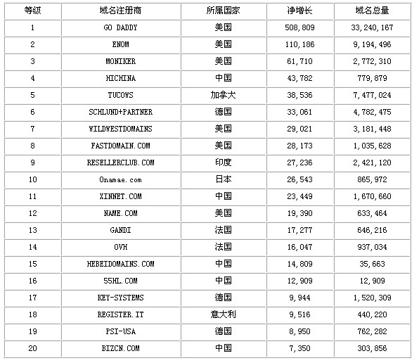 由上表格可以看出,美国的GODADDY作为全球最大的域名注册商当然稳居第一,净增长和总域名都远远高于其他国家。中国的最大域名商HICHINA(万网)这次终于赶上了新网,成为中国增长最快的域名注册商,紧紧跟在美国注册商之后,排名第四,也是据本站统计到现在,历史成绩最好的一次。全球前20个域名增长最快的注册商中,仅仅美国就占了6个,中国占了5席。