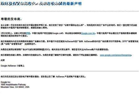 3月26日,有网友反映,Google AdSense向用户发出邮件声明,将继续向内容发布商提供完善的广告解决方案。其中基于内容匹配的AdSense内容广告和 AdSense移动内容广告的展示均不受影响。DFP广告管理系统(原“谷歌广告管理系统” )也照常运行。(完)