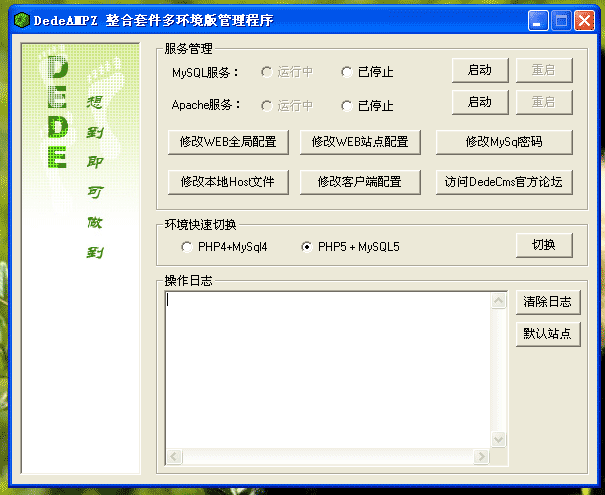 DedeAMPZ 是直接整合PHP + Apache + MySql 的服务器环境管理软件,操作十分傻瓜化,适合初中级水平的站长使用。该套装默认搭载dedecms。安装使用十分简单,并支持在php4与php5中切换。同样也可以调试其他PHP程序,只要放在wwwroot目录中即可。