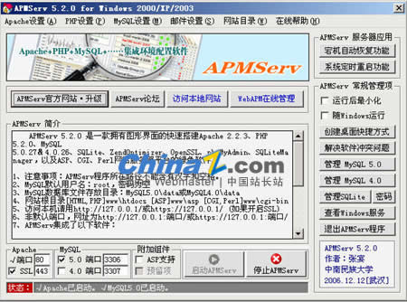 PHPStudy不一样,它含有IIS+PHP和Apache+PHP,软件推荐设置是后者。在任务托盘里也有图标,可以打开面板来看服务运行状态,也很简洁。一次性安装,无须配置即可使用,是非常方便、好用的PHP调试环境.该程序不仅包括PHP调试环境,还包括了开发工具、开发手册等.总之学习PHP只需一个包.对学习PHP的新手来说, WINDOWS下环境配置是一件很困难的事;对老手来说也是一件烦琐的事.因此无论你是新手还是老手,该程序包都是一个不错的选择.