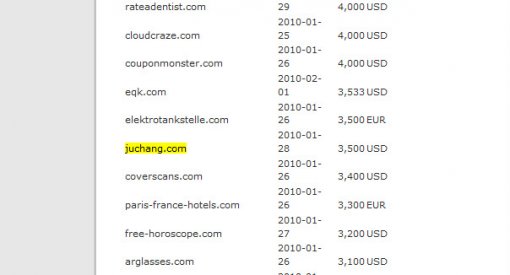 我找到的最早一个历史记录是2005年的。原帖地址:http://www.domain.cn/club/viewthread.php?tid=40905 。 此帖显示juchang.com在城里投资者Wappy手上。有米友透露juchang.com在08年曾以2150元流出过一次,2010年3月以38万成交。原文:http://www.xiuyu.com/archives/1352 我觉得前者有可能,后者不可信。Juchang.com 正如其含义一样巨长,7个字母,比起其他视频网站的域名相对较长,不利于网友输入。而且含义一般,剧场,不是非常常用的词汇。而且酷6这次收购隐藏的很深,风声丝毫未漏。 而且多方消息都证实juchang.cn成交价没突破2K,可见酷6伪装的多好,身份未暴露的情况下, juchang.com 是绝对不可能38W成交的,我认为38W的说法都是米友杜撰,空穴来风。另外,此米曾在易名上出售过,要价也只是5位数,没敢要6位。 为了给广大米友调查个明白,我花了不少心思。透过查询国际域名成交记录,我认为此米3500美金的成交价可能性最大。点开这个http://www.domanium.info/category/sedo,在浏览器编辑上查找juchang.com 可以看到,此米在2010年1月28日以3500 USD成交(合计23800RMB),我认为应该就是KU6在SEDO上拍下的。