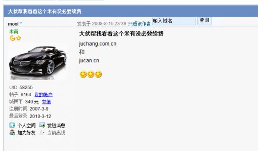 大家看到了没,juchang.com.cn的原持有者Mooi(juchang.cn也在他手里) 在2008年8月份,在城里发帖说域名块到期了,有没有必要续费。说明当时持有者也不是很看好这个域名,有放弃的心思。现在看看很滑稽哦,因为现在这个不被持有者看好的域名已大网络公司收购。 不过后来Mooi 又续费了,于2009年快到期时卖给了城里的kissmore,上图:
