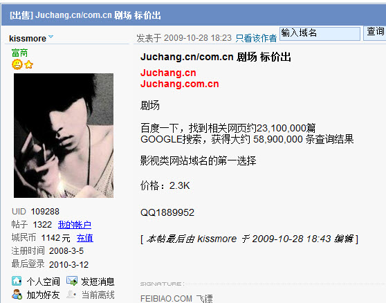 至此,juchang.cn/juchang.com.cn 这组域名与2009年9月就到了Kissmore手里。估计成交价格很低。 Kissmore收购没多久就标价出售 2.3K ,上图