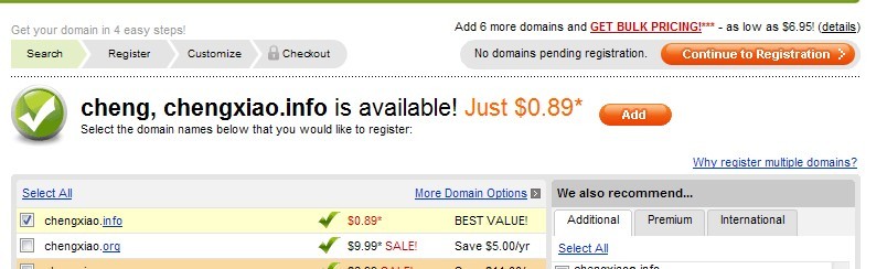 这次我用info域名为例,因为我没有信用卡,直接买com域名的话太贵,而且本人暂时没什么需求,info域名正好在促销,而且更适合商务信息类网站.