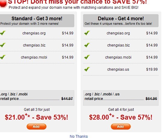 点击GO,即可进入购物筐界面,这里会给出相关域名购物和一些优惠信息,不理他点击ADD后直接选continue