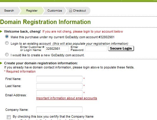 接下来的信息,是域名持有人的信息,由于之前我注册过godaddy的账户,所以这里直接登录可以免去填写.