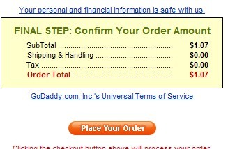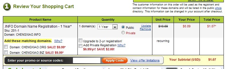 好吧,终于到结账的地方了,虽然步骤很多,但真的很佩服godaddy,嘿嘿,info促销0.89$加税后事1.07$,还是蛮便宜的.