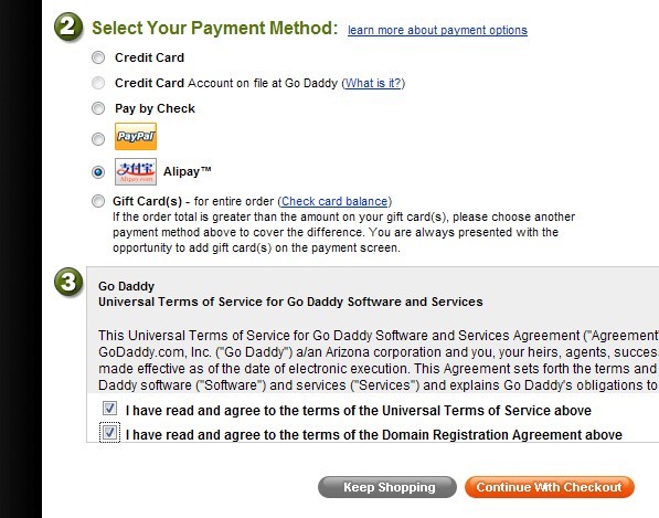 值得注意的是,如果你要购买其他域名的话可以再这里输入优惠码,圣诞优惠输入BUYCOM99可以0.99$买com域名,不过只支持信用卡支付,所以这也是我选info注册的原因.然后就可以在下面第二部选择支付方式了,我们可以清楚看到支付宝的图标.