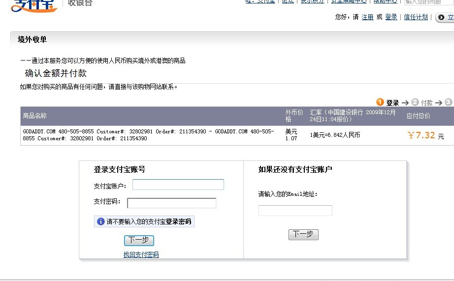 继续continue,就看到熟悉的中文界面了,支付宝,泪奔~~o(╯□╰)o,不容易.在这里可以看到汇算比率,然后输入支付宝账户和支付密码就可以付款了.