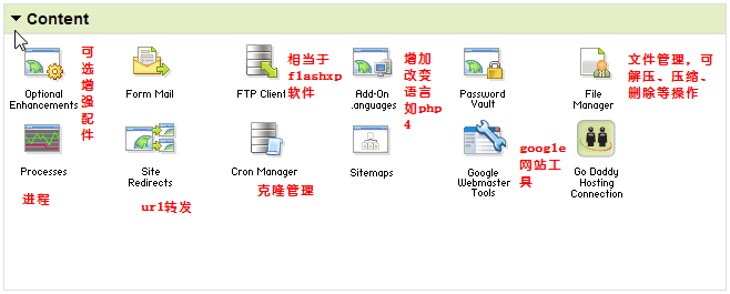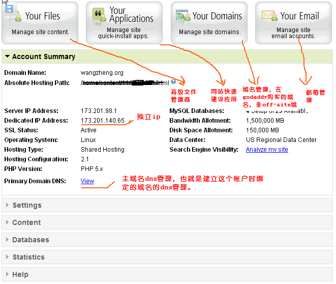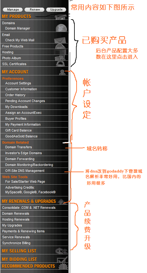 域名管理及相应解析方法相信大家看一眼就会操作了,不再多说,下面进入godaddy主机管理菜单。