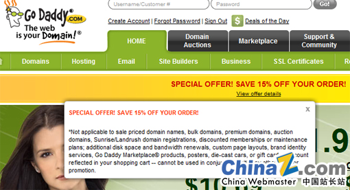 全球最大的域名注册服务商Godaddy在今天再次推出注册优惠码服务,针对域名新注册与续费服务价格优惠15%,其他服务不在本次优惠之列,这是Godaddy在2010年之初推出的第三个优惠政策。