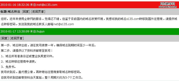 我的 s135.com 域名是在“新网”的代理商“上海企联网”注册的,于是在2010年1月16日向代理商索要域名转移密码。代理商要求续费一年显然是想最后捞一笔,但是我域名的到期时间也会增加一年,域名转出要紧,我就不想在这上面和代理商纠缠了,续费了一年。