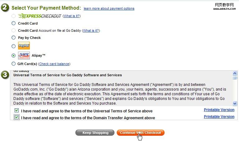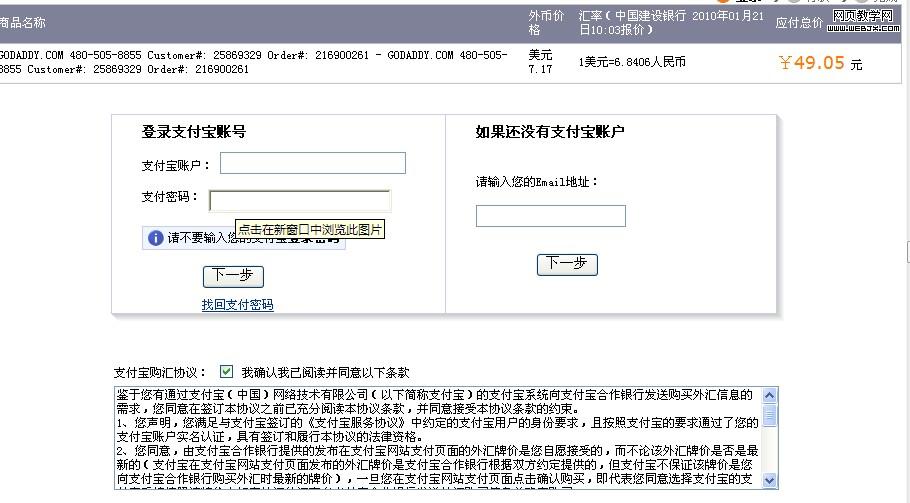 6、选择使用“支付宝”付款。使用“支付宝”付款要比VISA信用卡要安全得多。VISA信用卡在国外消费只需要信用卡卡号、信用卡正面的英文姓名和背后的3个数字即可,无需实卡,每次交易不需要输入密码。一旦输入你的信用卡信息,商家将来可以无需征求你的同意自行扣款(例如当你选择自动续费时,域名到期商家就会自动从你的信用卡扣款续费。),如果信用卡信息被盗,后果更是不堪设想。