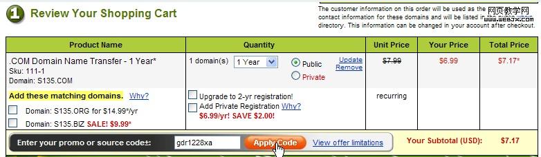 5、这一步可以输入Godaddy优惠码。即使不输入优惠码,域名转入默认已经有优惠, .com域名转入续费一年的价格为6.99美元,再加上0.18美元的税,共计7.17美元,折合人民币不到50元。