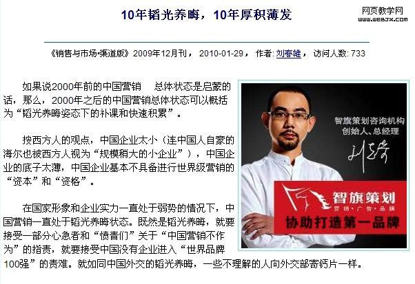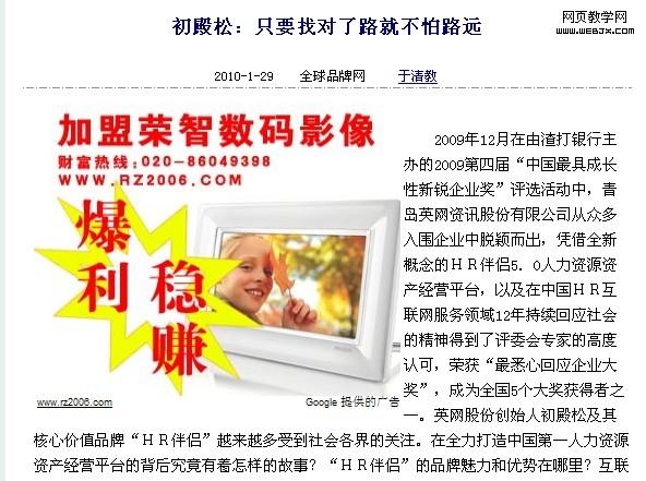 至于搜索引擎的文字推广,我们已经有共识了,绝对是左侧可行。至于在大门户和地方门户网站上首页投放的图片广告我们不谈,在门户首页上投放广告通常都是做品牌推广和新产品推广而已,不是做精准营销广告,所以我们谈一些比较切合一些中小企业(实指没有庞大资金投放广告的企业)的广告投放例子来探讨一下,说明图片广告位置的影响因素。比如说在一些行业网站、门户网站的文章内容页里投放图片广告,再细举例两个网站“全球品牌网”和“中国营销传播网”,两个均是国内比较权威的市场营销网站,其对外公开的赢利模式是广告模式收入,其中以通栏、左侧、文章页,栏目顶部底部为主,我们就谈文章内容页的图片广告,通常一些以广告为赢利点的网站,单片文章内容的左上角或左中部、左底部都会放置一个像素比较大的图片广告,再以全球品牌网和中国营销传播网为例解说,全球品牌网的读者群都是一些企业老板、经理人和销售员一线的市场营销人员,那么广告主对象是一些戒烟解压产品、各类企业管理软件、职业书籍以及各类培训课程为佳,由于读者准而不泛,而且数量绝对有限,因此不适合做品牌推广和新产品推广!全球网文章页的图片广告布置在文章内容的左上角,与普遍网站比如网易、凤凰网一样,所以是中规中矩,形成了所有人都知道这是个广告,一般不会点击,所以要获得点击单在这里都要下一定的功夫量,成本又在增加。