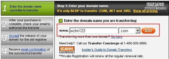 3、输入需要转移的域名。比如我要转移的域名是 www.wzlm123.com,然后点击GO!