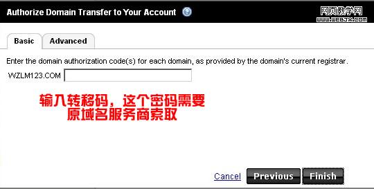 13、输入域名转移密码。这个密码需要原域名服务商索取。网赚联盟的域名原注册商是名富网,只需要登录域名管理页面,轻轻点击一下将域名转移码发到邮箱就可以轻松获取到转移密码,非常方便。附:查看文章下面的国内各大注册商申请域名转移说明资料。