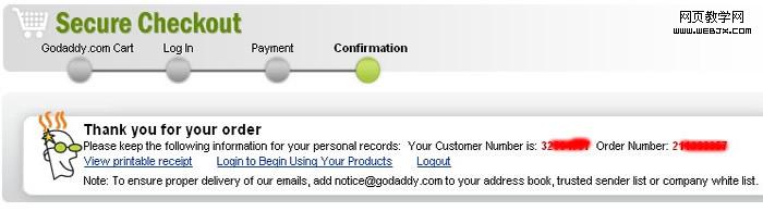 7、确认支付信息。这里填写Email是用来收取GODADDY的订单和域名处理状态的邮件。接着点击“Place Your Order”就跳转到支付宝支付页面,输入支付宝帐号和支付密码完成付款。注意:支付付款请使用IE内核浏览器。