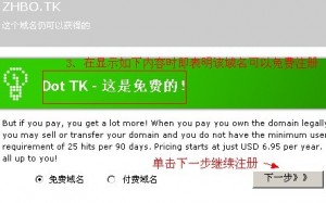 如注册“zhbo.tk”域名,仅仅填写“zhbo”即可。然后点击“下一步”继续注册。