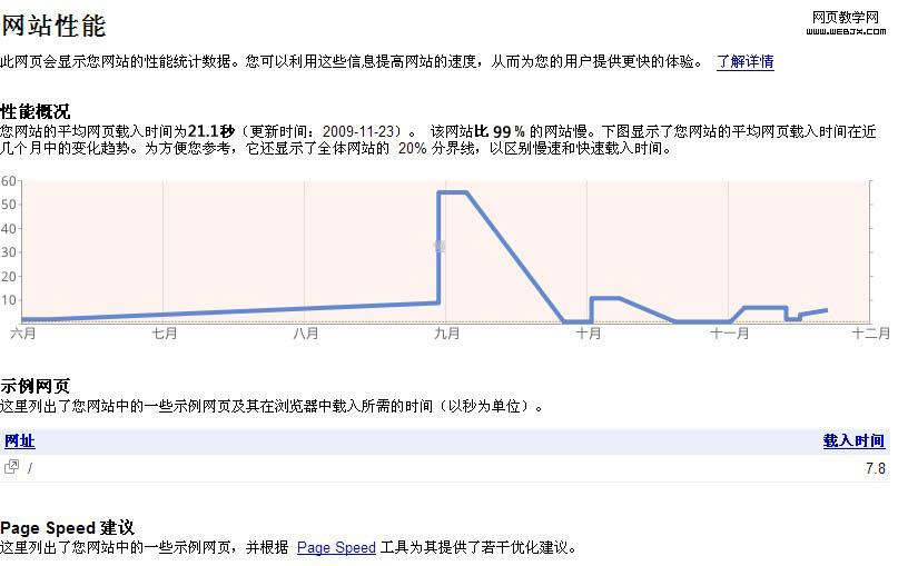 报告显示我的博客平均的页面打开时间为21.1秒,99%的网站打开速度都比我快。囧!