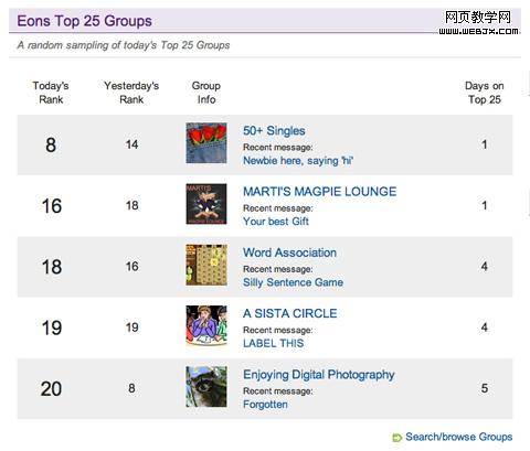 Eons在首页的右边显示了一些用户的群组。