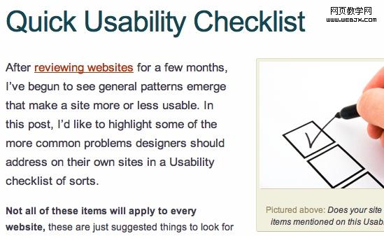 你也可以考虑一个快速终极检查列表,它是由David Leggett所写,它强调了一些常见的问题,这些问题设计者可以通过一个有用的检查列表在他们自已的网站上得到解决。并非这些项目对每一个网站都适用。这里只是建议你在自已的网站上寻找。
