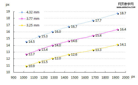 可以看出笔记本和台式机的尺寸相差很大,为方便使用,使用各分辨率的主流尺寸或平均尺寸计算出指定字号在每个分辨率下所需的字号。(下图去掉了基本只用在笔记本上的那些分辨率),以4.32mm、3.77mm、3.25mm为例(17寸1280*1024分辨率下的16、14和12号字):