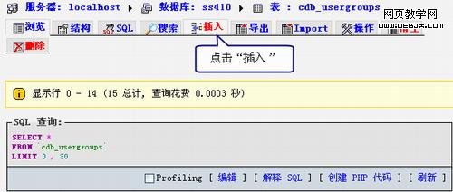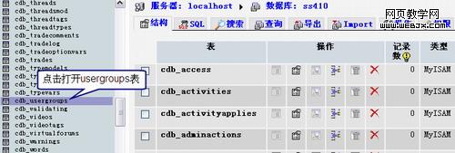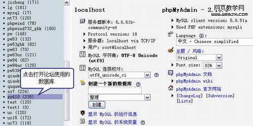 打开 phpMyAdmin => 打开论坛所使用的数据库: