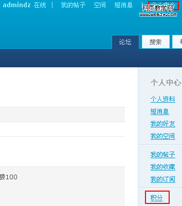 会员登录论坛前台 => 个人中心 => 积分,如下图所示:
