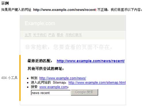 Google提供的404页面工具,可以在页面错误发生时给出一个智能搜索框和一个最相关的链接地址。这项工具提供的是基于Javascript的网页,当出现404错误时,Google将在网页上列出一个内容和一个与“失踪”网页的最相关的其它地址,并提供一个基于Google的站内搜索框。