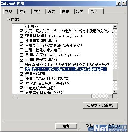 IE浏览器是我们登录FTP服务器最简单、直接的工具之一,默认使用的是主动模式,切换方法比较简单。启动IE后,打开“工具”菜单中的“Internet选项”,将打开的窗口切换到“高级”选项卡,选中其中的“使用被动FTP”选项并保存设置即可(图1)。