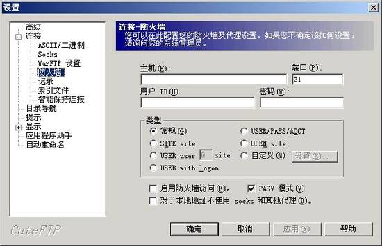 CuteFTP可以说是FTP类工具的泰山了,启动CuteFTP后点击打开“编辑”菜单下的“设置”命令,在打开的窗口左侧依次选择“连接”—“防火墙”,然后将右侧下方的“PASV模式”项选中就可以了(图3)。