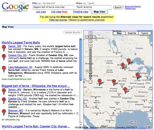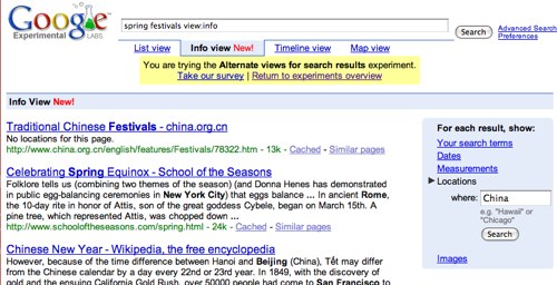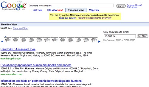Google 的第一个实验性搜索引擎,虽然简简单单叫个“可视性搜索排列”,但或许对某些用户而言,一种崭新的有条理的搜索排列才最有吸引力。举个例子,时间线浏览方 式会将所有的搜索结果用一个时间线组织起来,并将那些有关于你的搜索请求的结果在其上面表示出来,你可以选择一个时间段,然后和这段时间有关的搜索结果就 会被挑选出来了。