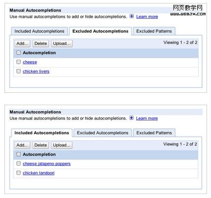 比如你做的是一个动批高仿尾货的网站,那么你可以控制让用户在你的搜索框里只要敲入了“f”或“fa”之后,就自动联想出“fall dresses”。你不仅可以设置自动完成哪些字,也可以设置不自动完成哪些字(上图)。